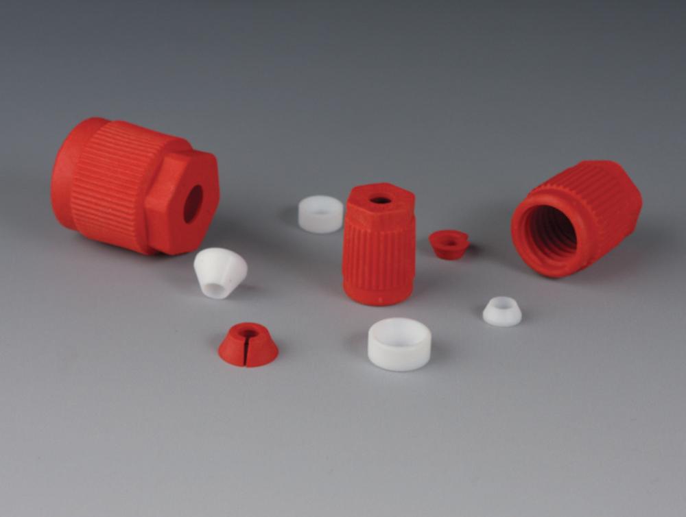The Bohlender Laboratory Threaded Joints GL 25 3.00 mm PTFE/HOSTA are designed to easily connect GL threads to fluoroplastic or other materials like glass and metal. Featuring a red screw cap made from glass-fibre reinforced ETFE, these joints include a sealing disc and PTFE tapered sealing ring. Ideal for laboratory use, these threaded joints withstand pressures up to 10 bar and can be used in a vacuum. Perfect for holding probes, sensors, and other laboratory components.