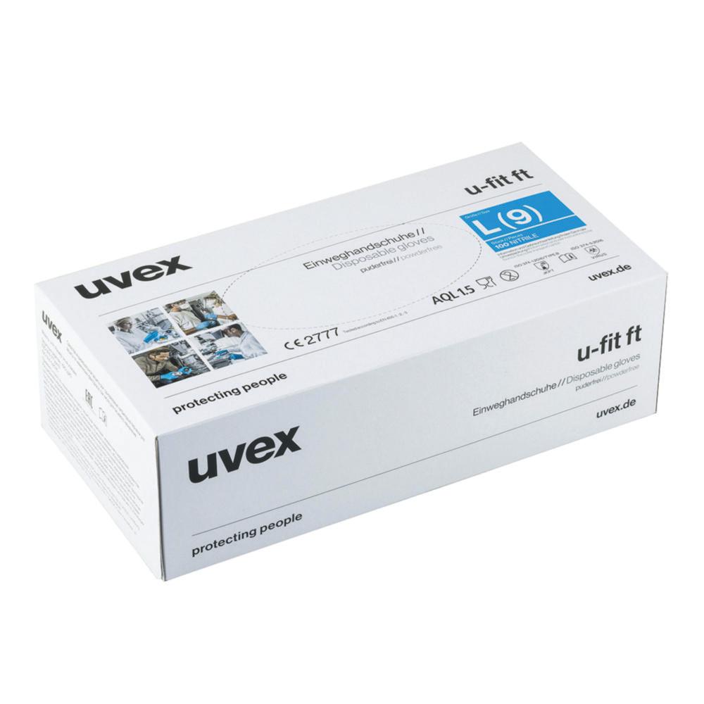 The Uvex Disposable Protective Gloves U-Fit FT Size L are designed for optimal protection and comfort in various industrial and laboratory environments. These gloves feature a seamless cotton liner and a 0.4 mm thick coating of nitrile rubber and chloroprene, ensuring durability and resistance to a wide range of chemicals. With a length of 32 cm, they provide extended protection up to the forearm.