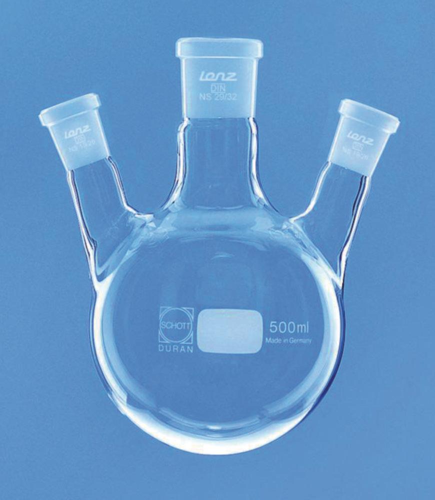 The Lenz-Laborglas Round-Bottom Flask 500 ml Three-neck, Side Necks Angled, Center Neck NS 29/32, Side Neck NS 19/26 is engineered for complex laboratory setups, offering enhanced versatility for reactions and distillations. Crafted from durable borosilicate glass 3.3, it provides exceptional resistance to heat and chemicals, ensuring long-lasting performance in demanding environments.